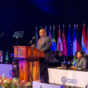 2月20日,在南非约翰内斯堡,南非总统拉马福萨在二十国集团外长会上致辞。