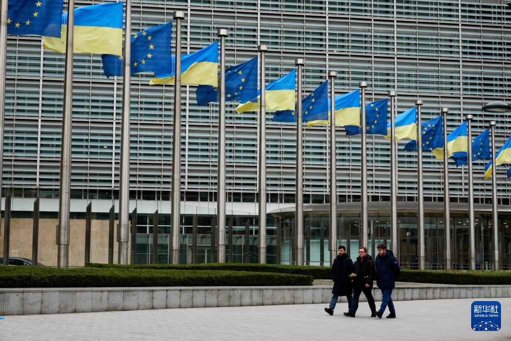 2月24日,在比利时布鲁塞尔,人们走过欧盟总部。新华社记者 孟鼎博 摄