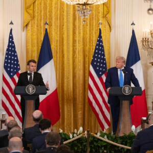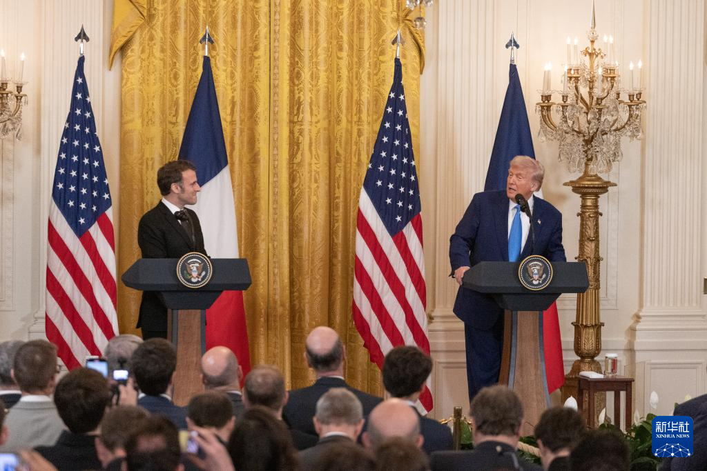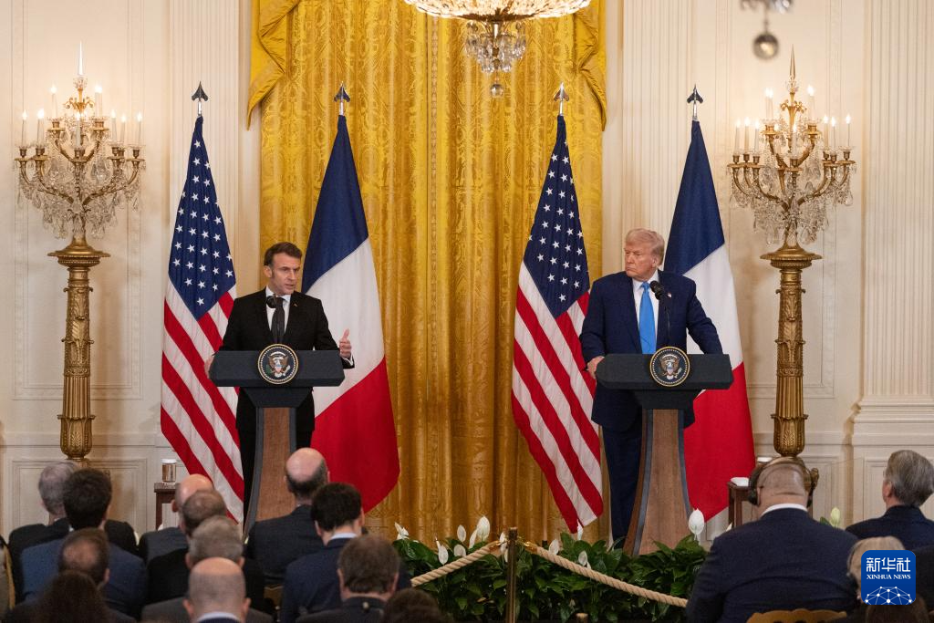 2月24日,美国总统特朗普(右)在华盛顿白宫与到访的法国总统马克龙举行会谈后的联合记者会。
