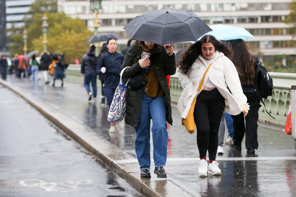 图为2023年11月2日,在英国伦敦,人们打着伞走在威斯敏斯特桥上。新华社发