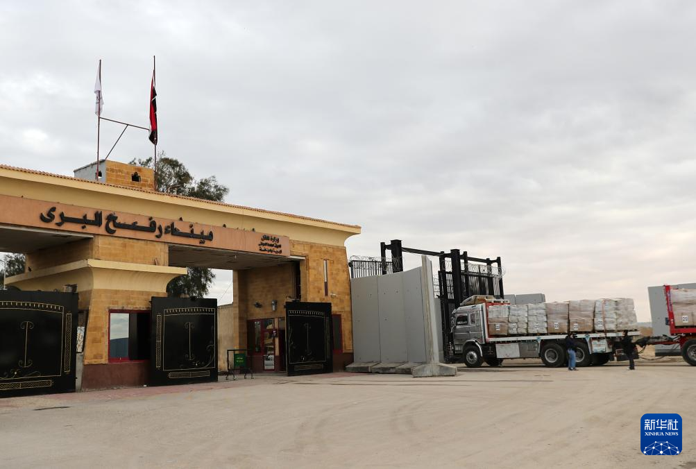 2月24日,运送援助物资的卡车通过拉法口岸埃及一侧进入加沙。