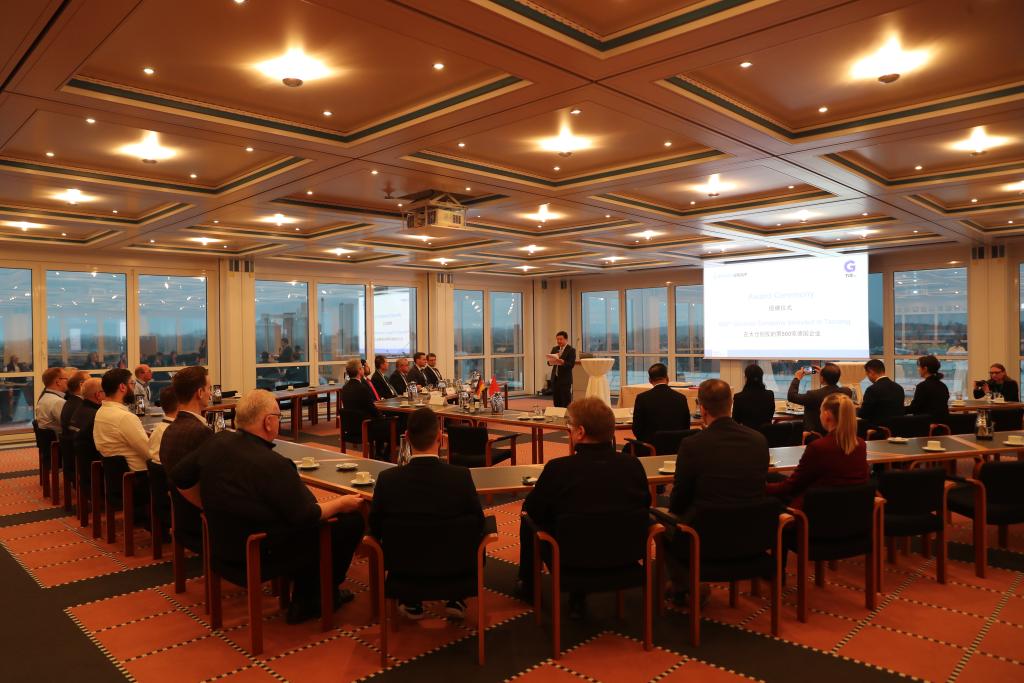 中国江苏省太仓市2024年1月22日在德国北威州贝库姆市为落户的第500家德企伯曼集团举行授牌仪式。新华社记者杜哲宇摄