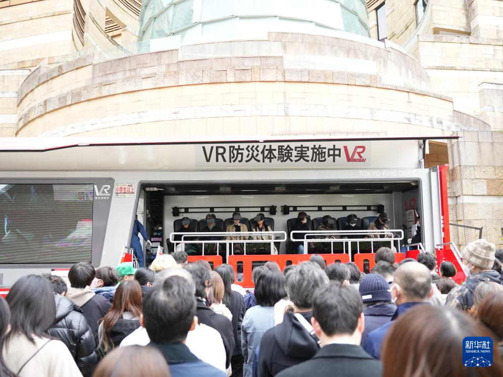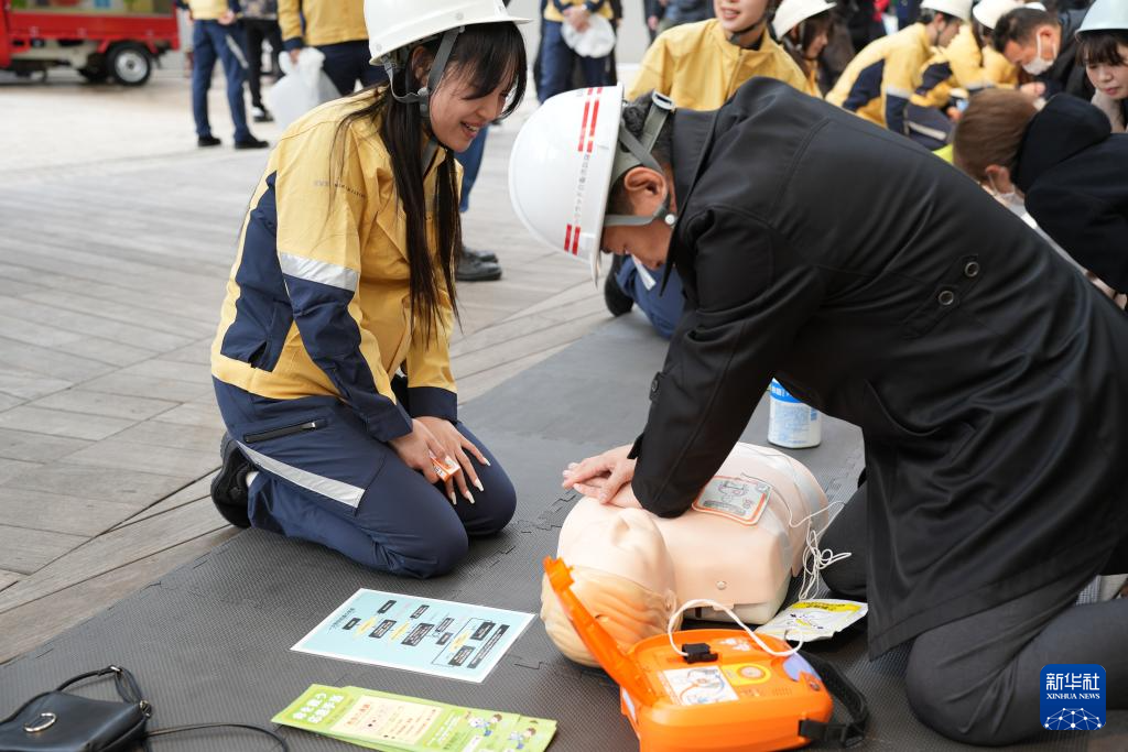 东京市中心六本木新城的广场上,人们在工作人员指导下学习胸外按压和除颤仪使用方法。广场一侧的帐篷内“浓烟”弥漫,人们听从指挥,以湿巾捂住口鼻穿越帐篷。另一侧,人们登上地震模拟车,体验在地震的剧烈晃动中如何自救,还向消防员学习消防水枪的使用方法。