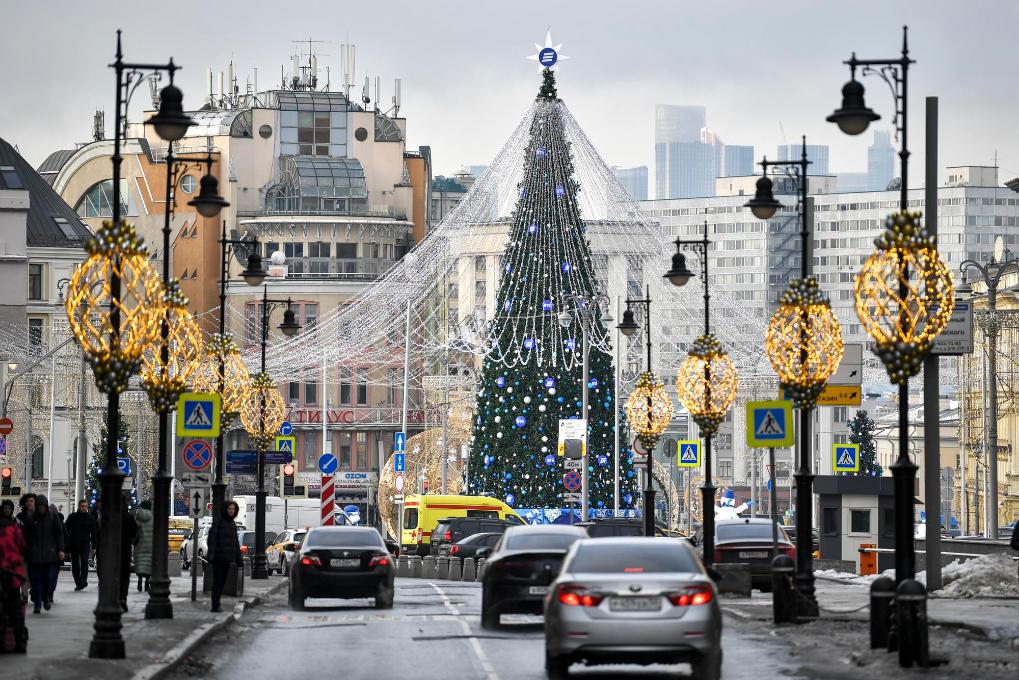 2023年12月22日,在俄罗斯首都莫斯科,车辆从新年枞树附近驶过。新华社发(亚历山大摄)