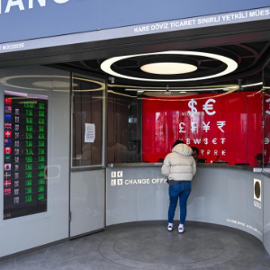 3月19日,顾客在土耳其伊斯坦布尔的一家外币兑换点办理业务。