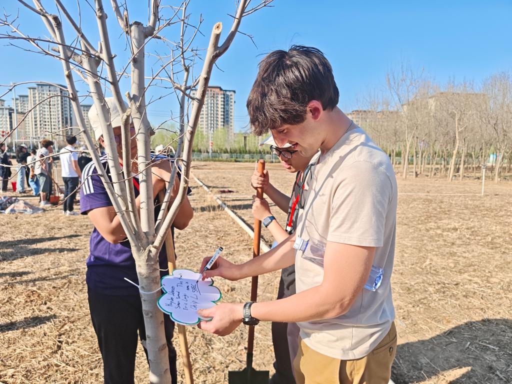 春分那天,中美青少年在河北省园博园种下象征着友谊地久天长的树苗。大家依次在姓名牌上写下自己的名字,还为小树取了名。