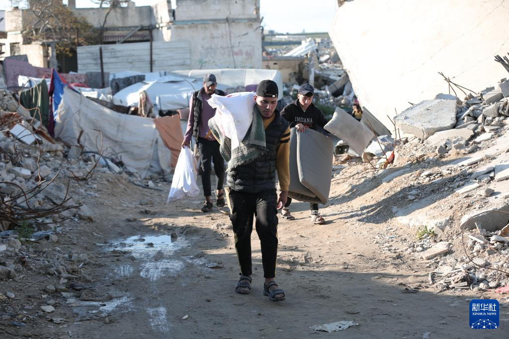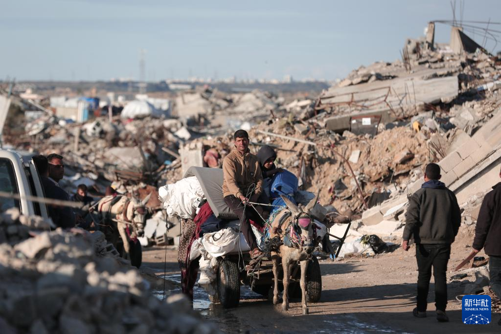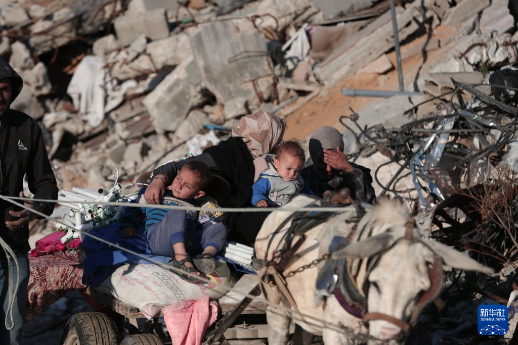 3月22日,从加沙地带北部拜特拉希耶撤离的巴勒斯坦民众经过加沙城。
