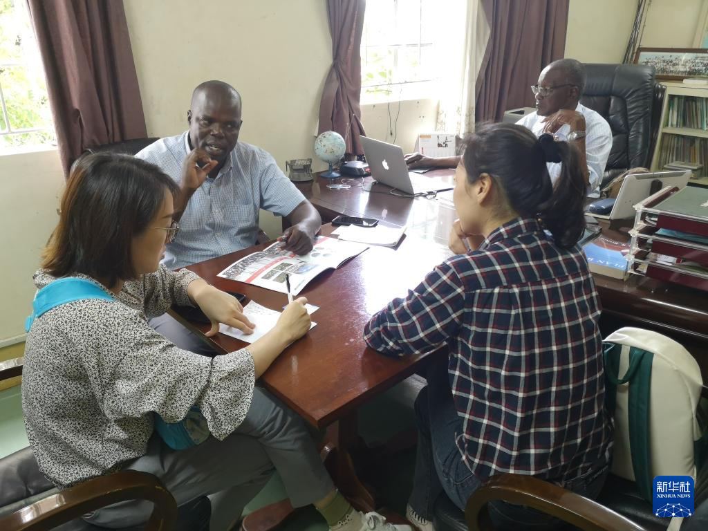 江西省生态文明研究院副研究员毛玉婷(前右)在肯尼亚基苏木与“维多利亚湖之友”主任葛弗雷·奥贡达(后左)交流项目实施情况(2019年12月9日摄,资料照片)。新华社发(江西省生态文明研究院供图)