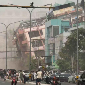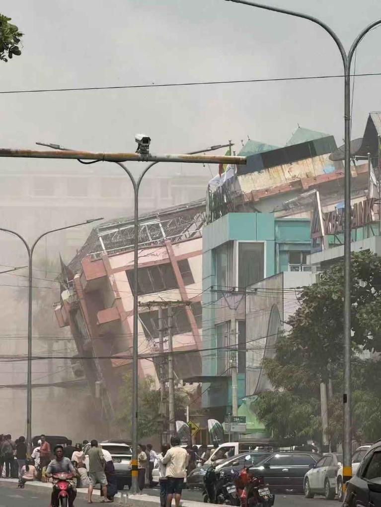 记者收到离震中较近的曼德勒现场图片,图片显示当地有楼体倾斜受损。