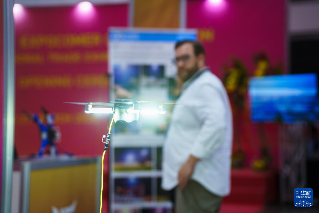 展厅中,一台特殊的无人机一直悬停在空中,机身下部还亮着灯光,十分吸引眼球。浙江极客桥智能装备公司外销总监赵建介绍,该无人机在照明领域有独特优势,在应急救援、大型赛事等户外夜间场景,替代了传统照明灯、照明塔。无人机通过地面供电,可实现整晚不间断照明。