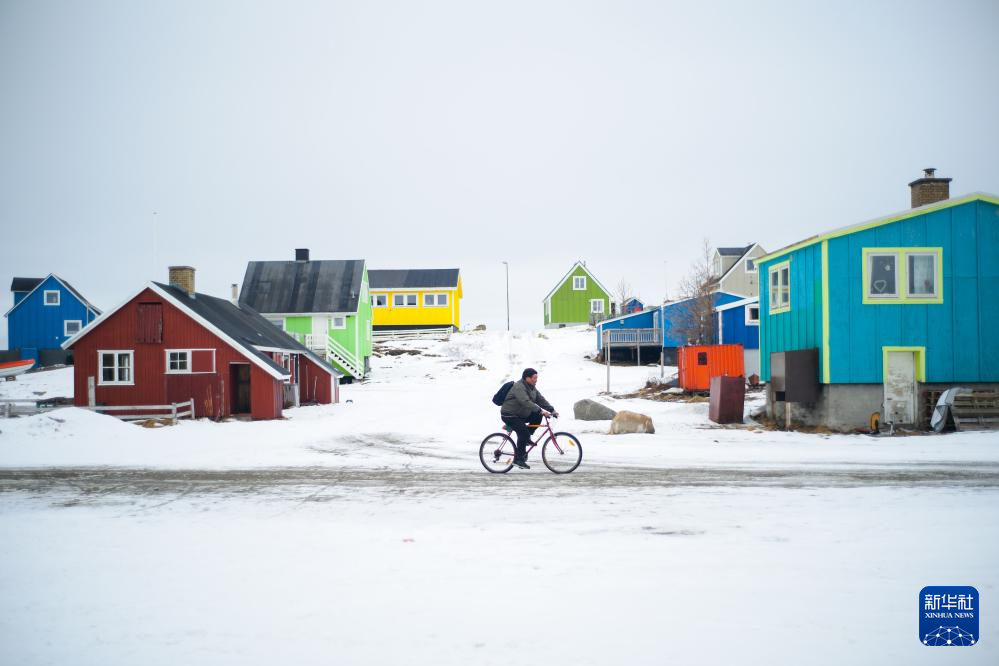 3月22日,在丹麦自治领地格陵兰岛纳尔萨克,一名男子在街道上骑行。新华社记者 彭子洋 摄