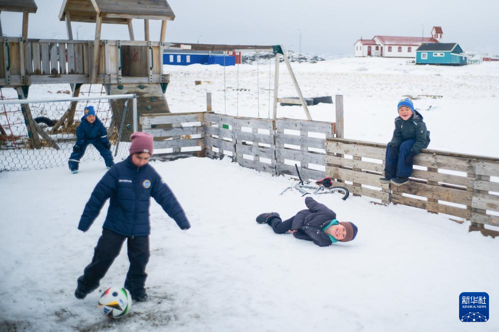 3月22日,在丹麦自治领地格陵兰岛纳尔萨克,孩子们在雪地里踢球。新华社记者 彭子洋 摄