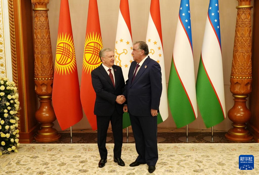 3月31日,在塔吉克斯坦苦盏,塔吉克斯坦总统拉赫蒙(右)与乌兹别克斯坦总统米尔济约耶夫握手。新华社发(扎法尔摄)