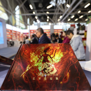 这是4月1日在意大利博洛尼亚举行的第62届博洛尼亚童书展中国展区拍摄的《哪吒》主题图书。