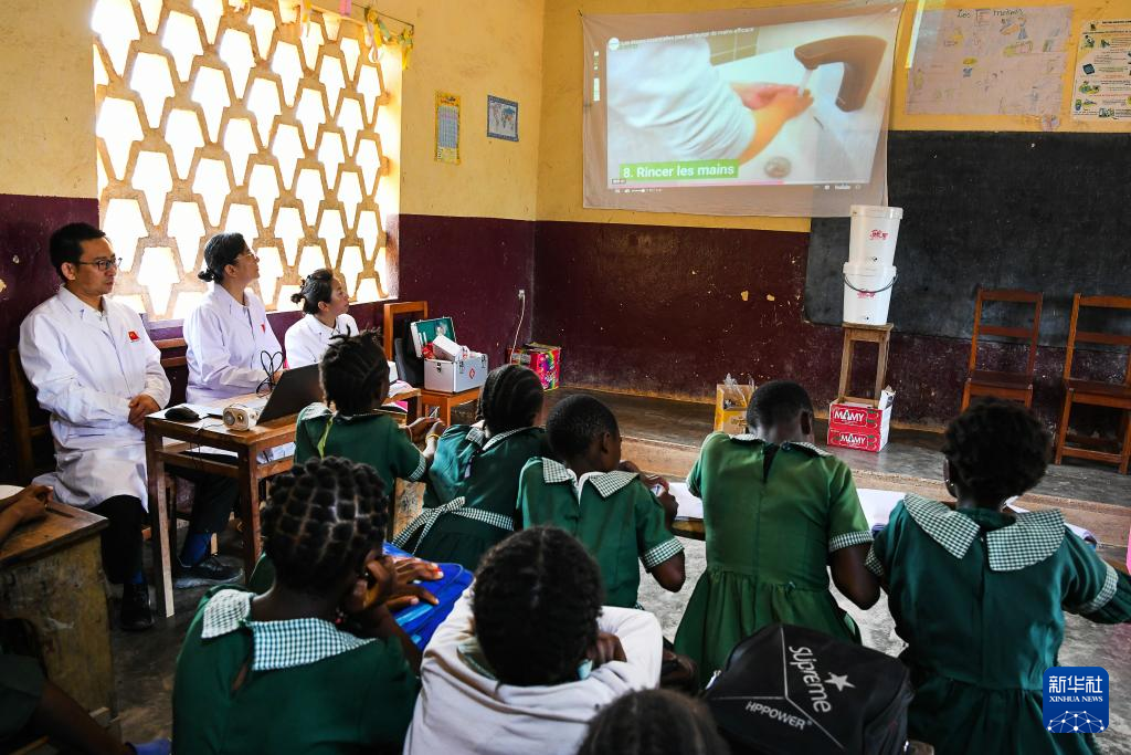 4月3日,在喀麦隆姆巴尔马约的一所小学,中国(山西)第24批援喀麦隆医疗队姆巴尔马约分队的医生教授学生预防传染病的方法。新华社发(科普索摄)