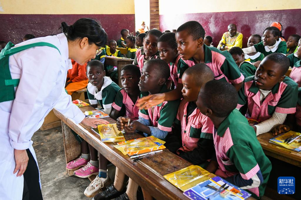 4月3日,在喀麦隆姆巴尔马约的一所小学,中国(山西)第24批援喀麦隆医疗队姆巴尔马约分队的医生与学生互动。新华社发(科普索摄)