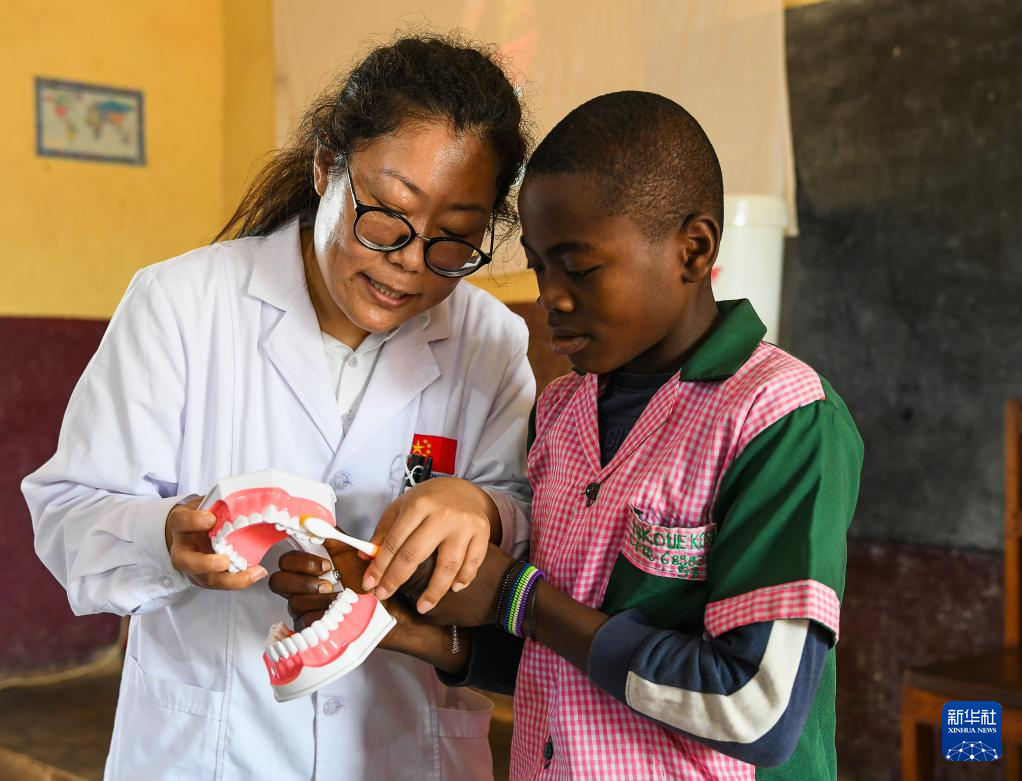 4月3日,在喀麦隆姆巴尔马约的一所小学,中国(山西)第24批援喀麦隆医疗队姆巴尔马约分队的医生教授一名学生正确的刷牙技巧。新华社发(科普索摄)