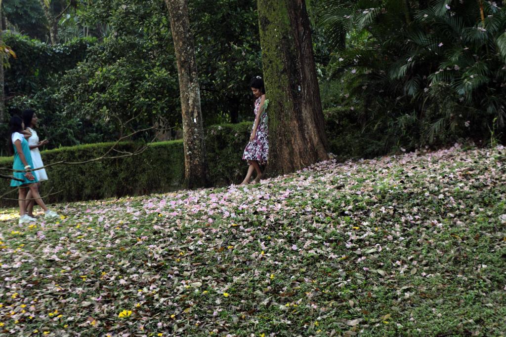 4月2日,在斯里兰卡康提,人们在开花的树下休闲。新华社发(加扬·萨米拉摄)
