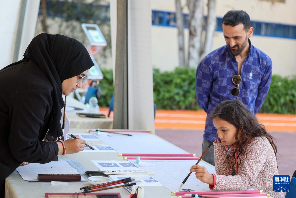 4月3日,在摩洛哥首都拉巴特的国立拉巴特高等矿业学校,一名女孩在“世界文化周”活动的中国展台体验中国书法。新华社记者 霍晶 摄