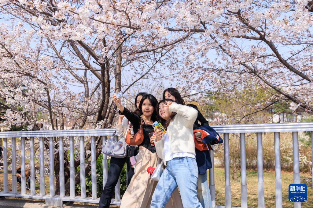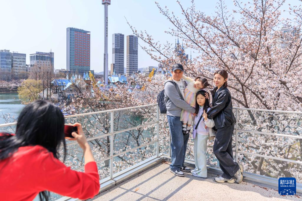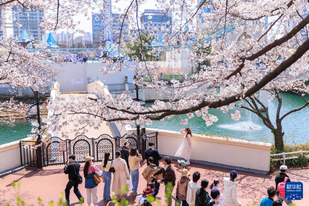 4月6日,人们在韩国首尔石村湖附近赏樱拍照。