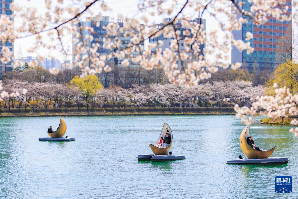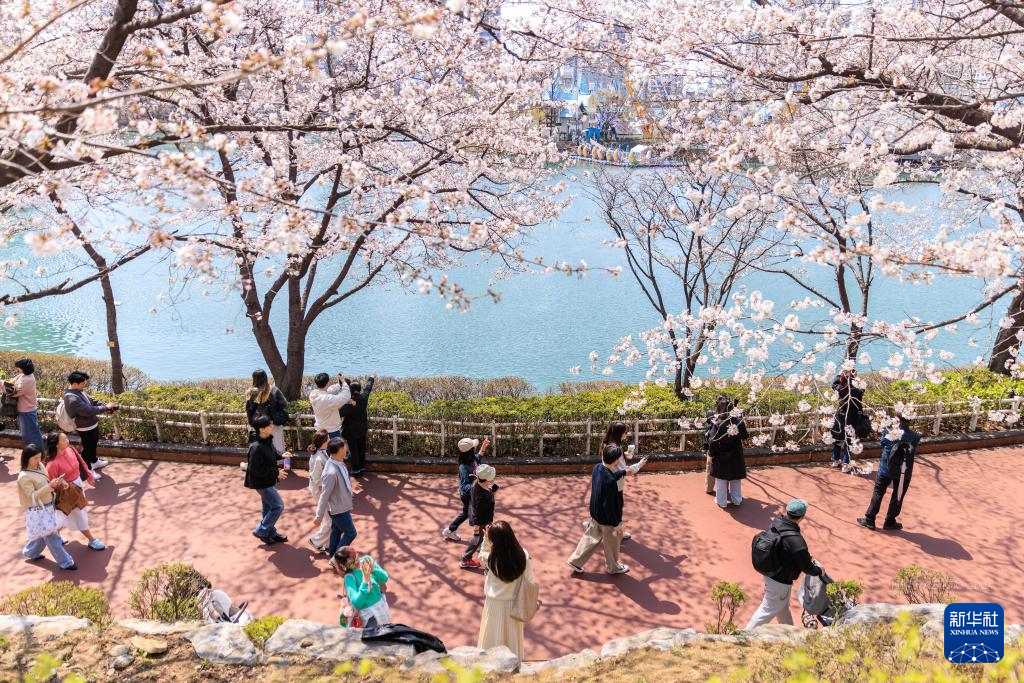 4月6日,人们在韩国首尔石村湖附近欣赏樱花。
