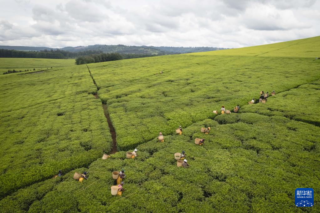 4月5日,农民在肯尼亚凯里乔的茶田采茶(无人机照片)。