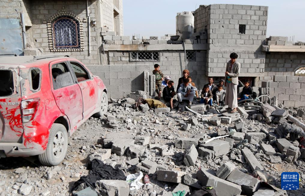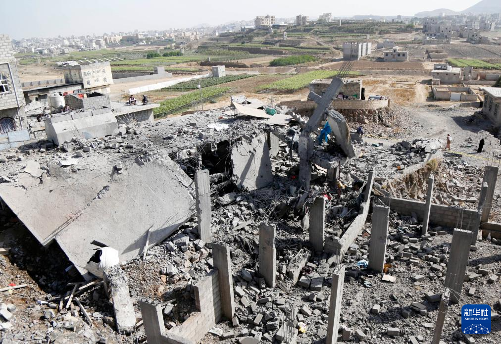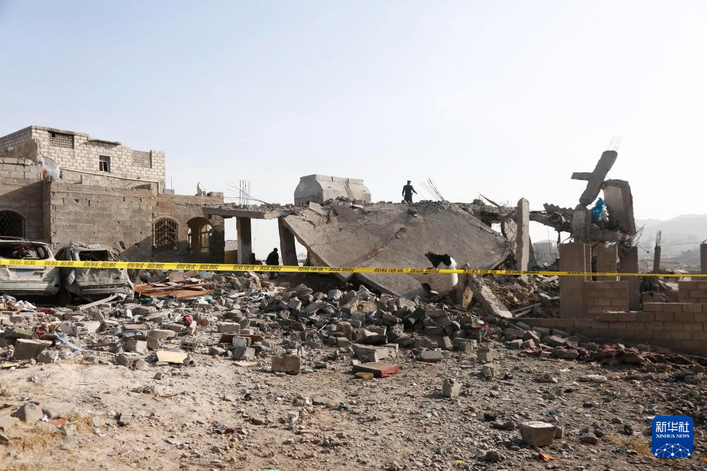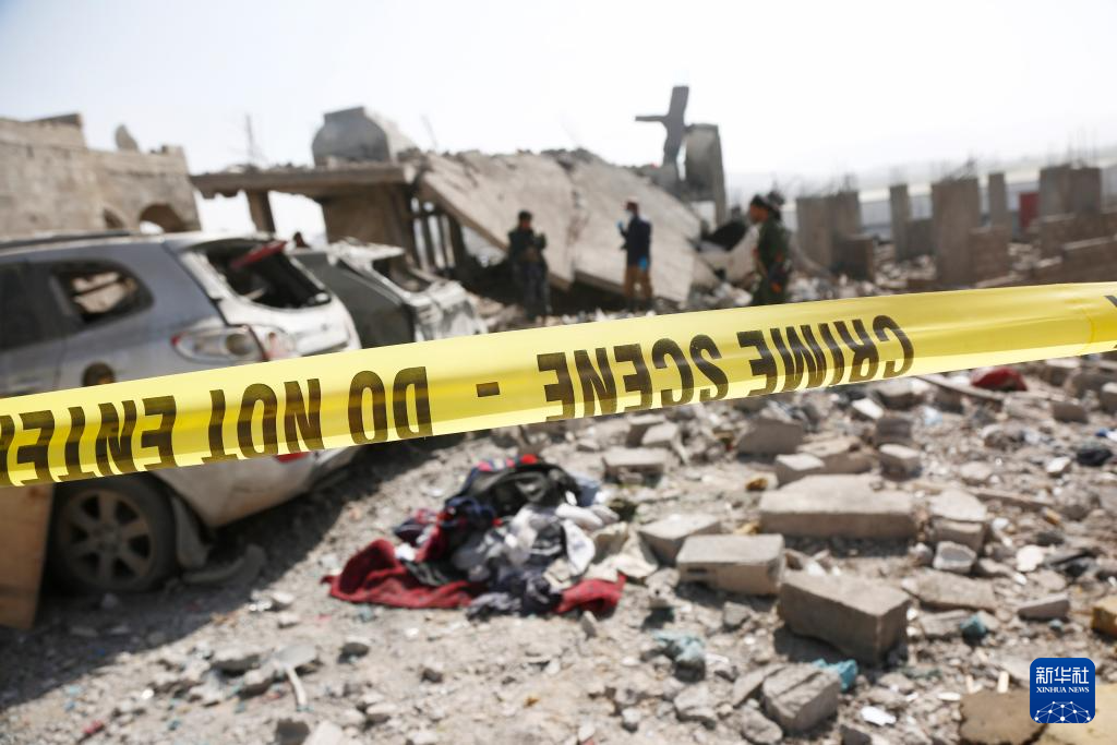 这是4月7日在也门首都萨那拍摄的美军空袭后的建筑废墟。