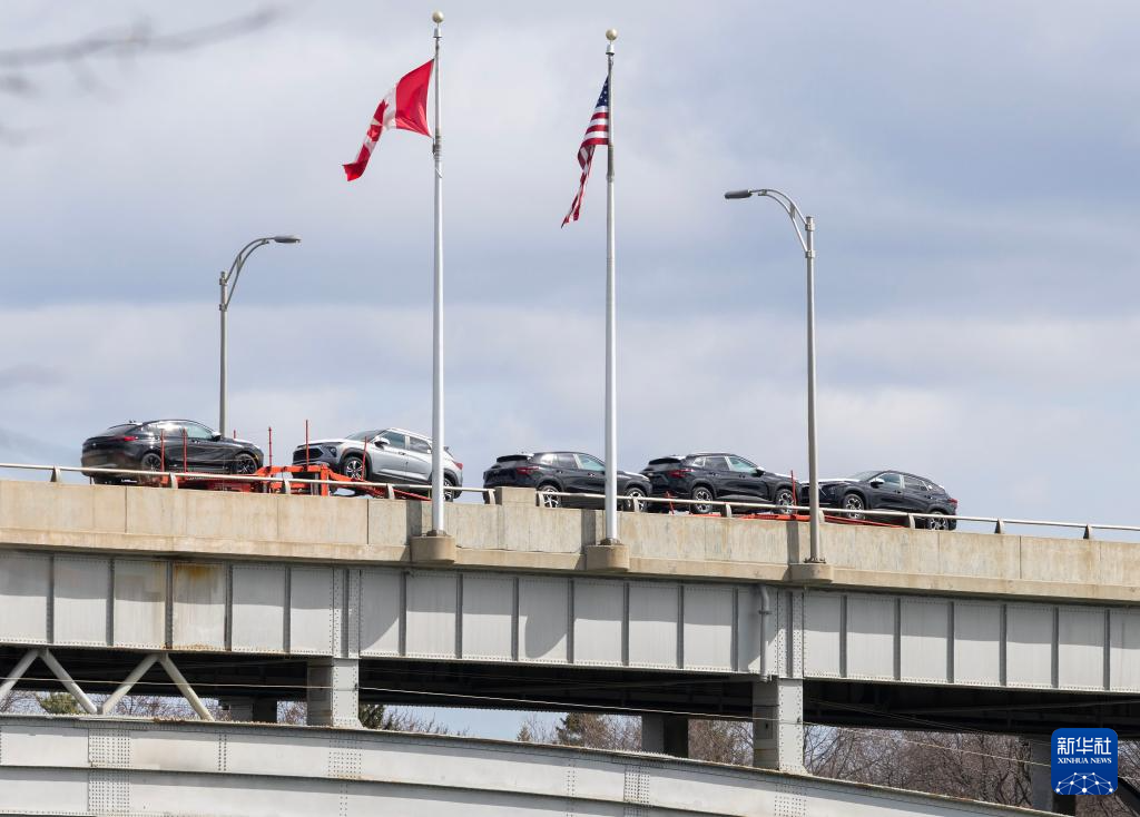 4月9日,在加拿大安大略省尼亚加拉瀑布市加美边境地带,一辆满载的汽车运输车通过刘易斯顿-昆斯顿桥开往加拿大。