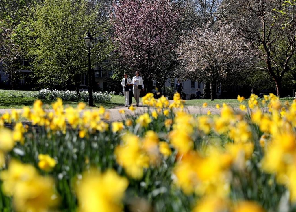 2025年4月1日,人们走在英国首都伦敦的圣詹姆斯公园内。新华社记者李颖摄
