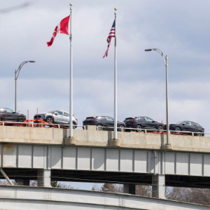 4月9日,在加拿大安大略省尼亚加拉瀑布市加美边境地带,一辆满载的汽车运输车通过刘易斯顿-昆斯顿桥开往加拿大。新华社发(邹峥摄)