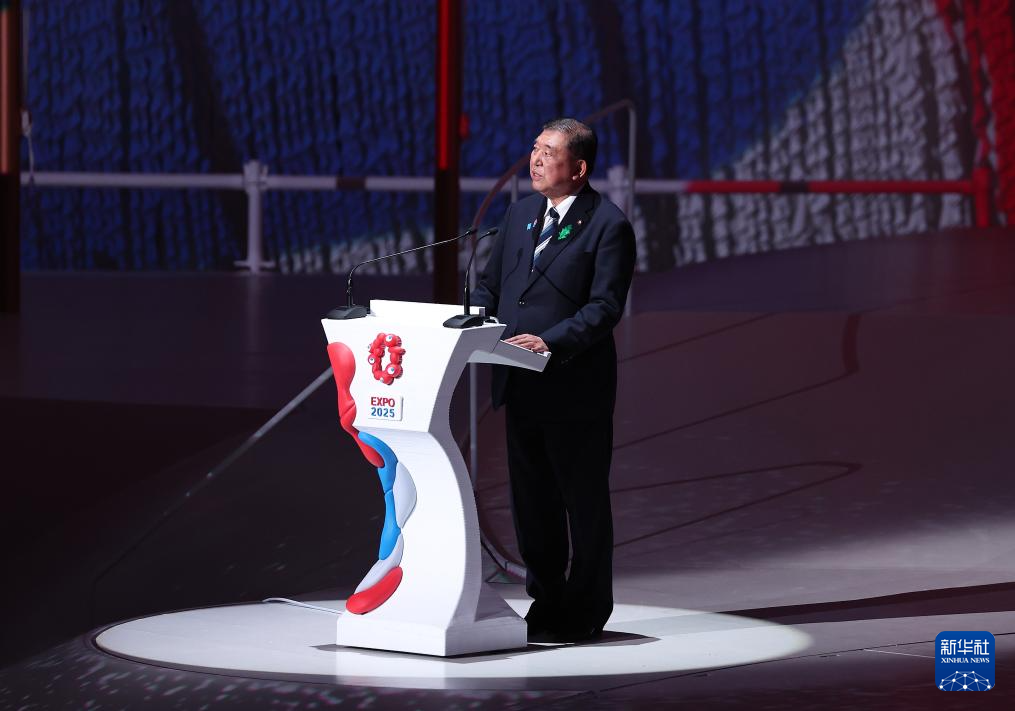 4月12日,在日本大阪,日本首相石破茂在2025年大阪·关西世博会开幕式上致辞。