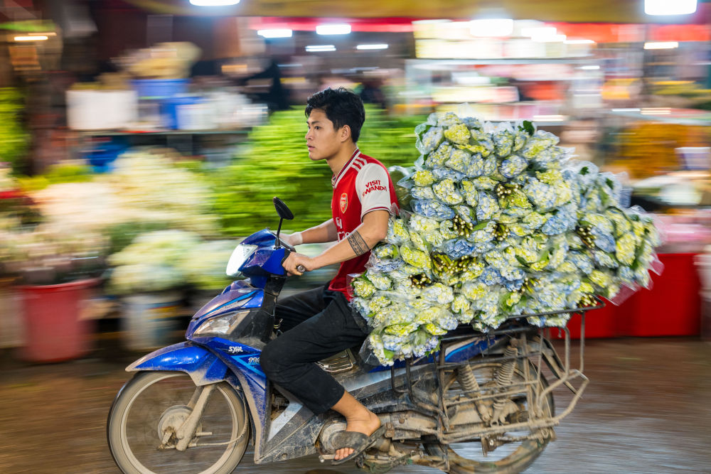 3月28日,在越南河内广霸花市,一名商贩在运送鲜花。