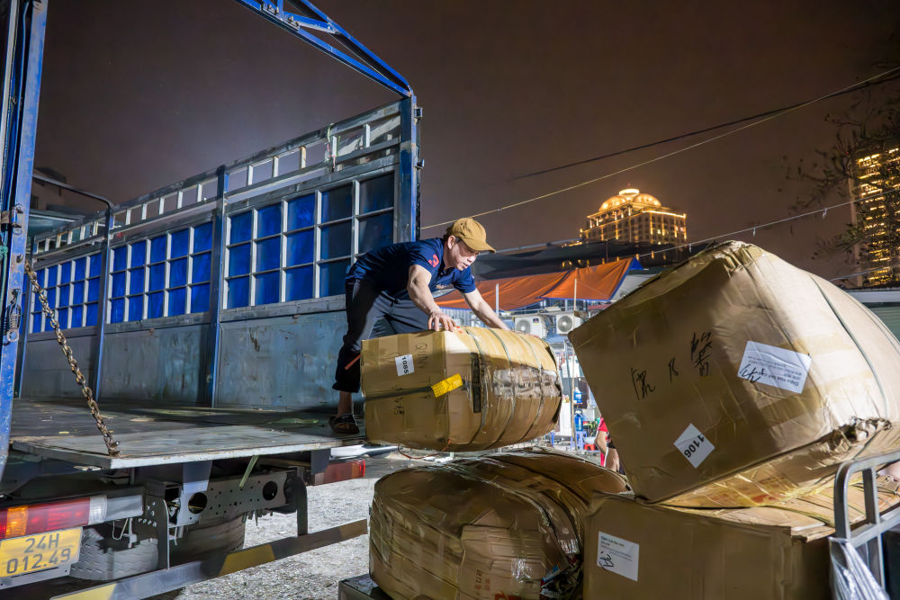 深夜的越南河内广霸花市灯火通明,一筐筐新鲜的玫瑰与百合在摊位间流转,花商们忙碌的身影与满载的货车勾勒出鲜花贸易的活力图景。