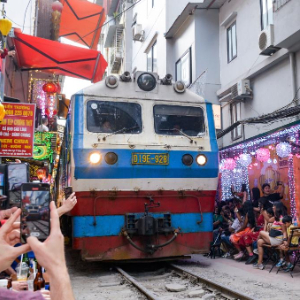 4月13日,在越南首都河内,一列火车经过火车街。