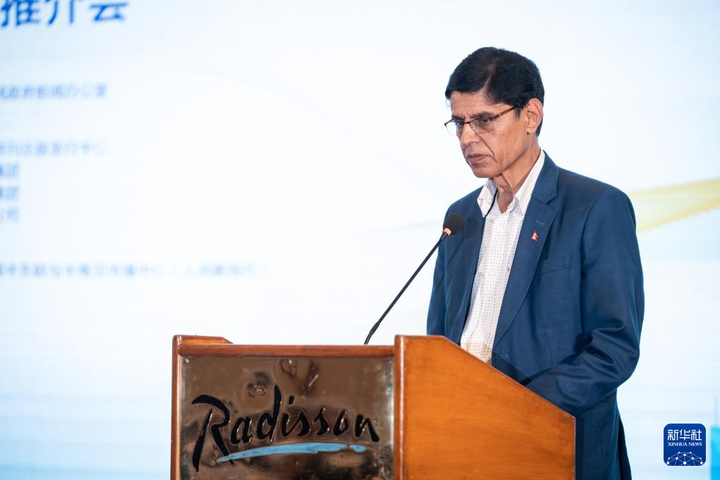 4月15日,在尼泊尔加德满都,尼泊尔文化、旅游和民航部部秘比诺德·普拉卡什·辛格在推介会上致辞。新华社发(哈里·马哈尔詹摄)