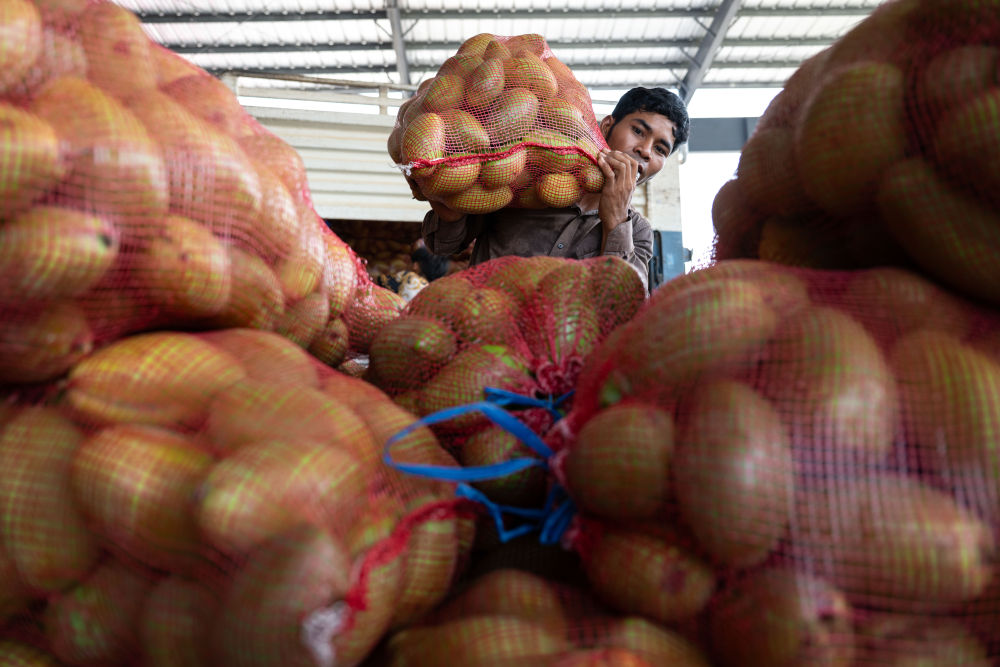 ↑在柬埔寨尖山县,工人在芒果干生产厂房内搬运芒果。