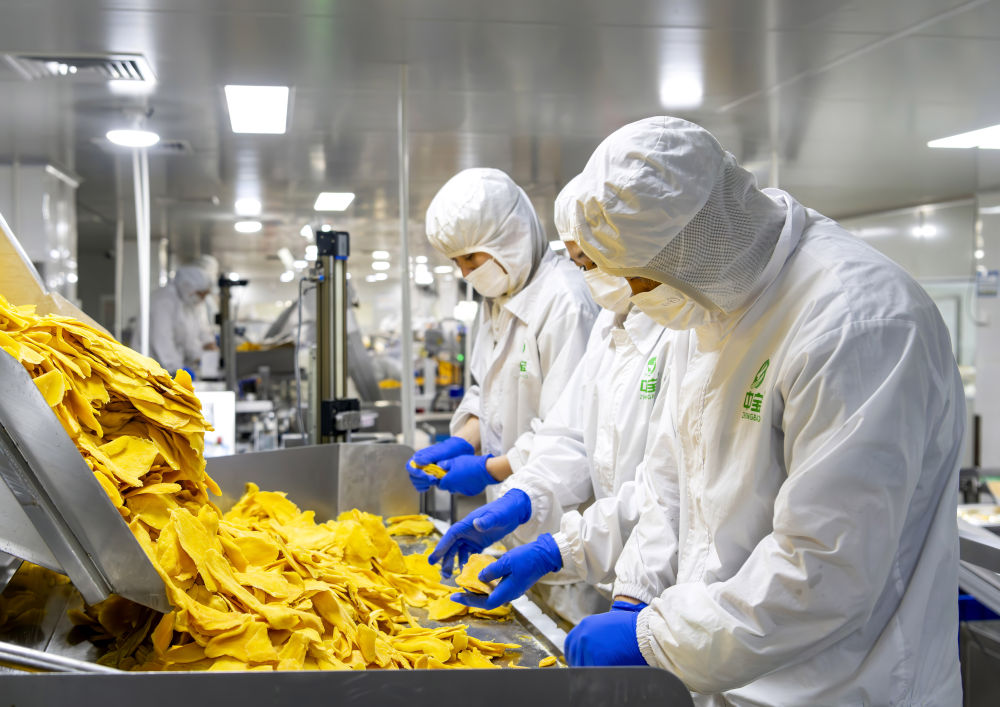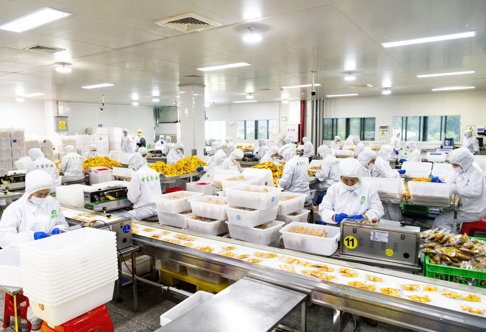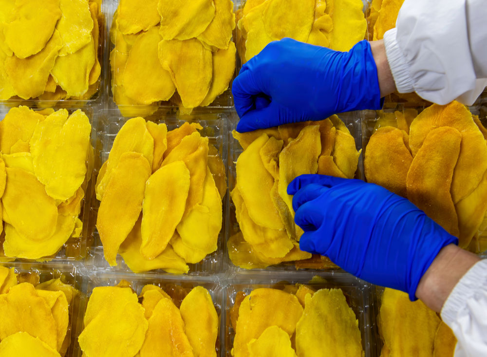 ↑在福建漳州的中宝(福建)食品科技有限公司食品加工生产线,工人分拣包装芒果干成品。
