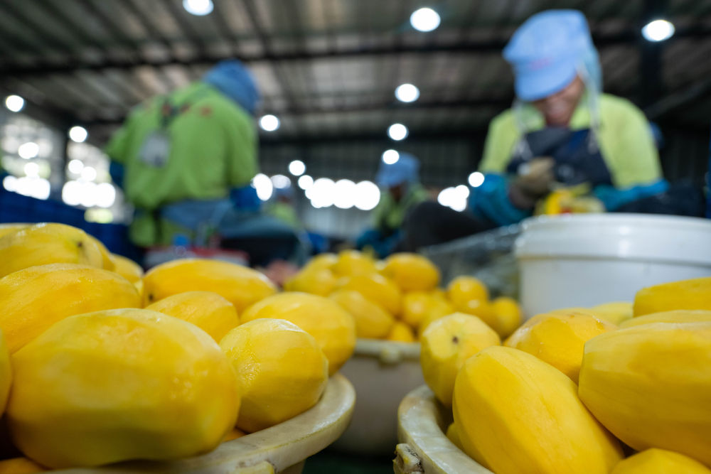 工人们忙着将鲜芒果采摘、装车,运送到附近的芒果干加工厂,经过清洗、削皮、切片、糖渍、烘干等工序,变成了一片片香甜柔韧的芒果干。