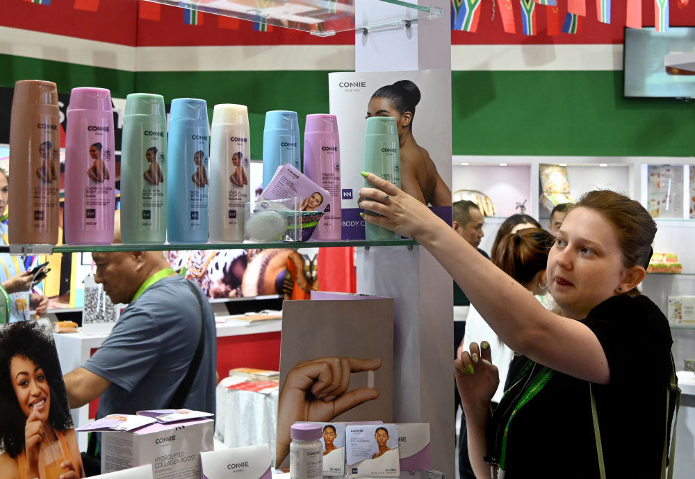 ↑4月16日,参展商在消博会4号馆的南非展区摆放展品。王颂 摄