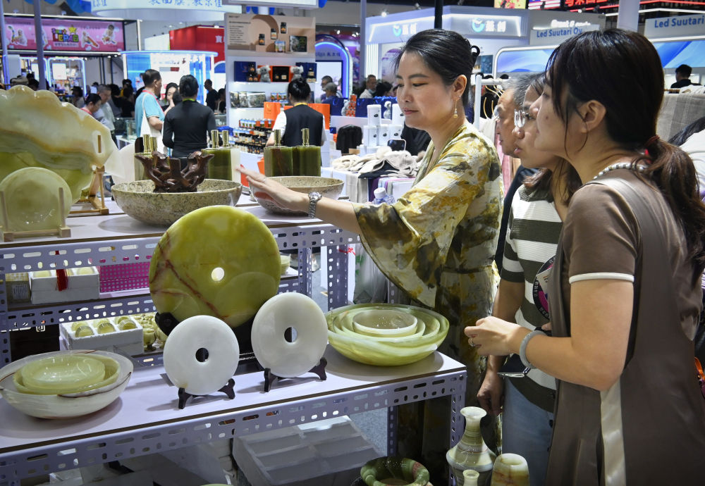 ↑4月16日,在消博会4号馆的巴基斯坦展区,参展商在介绍玉石工艺品。王颂 摄