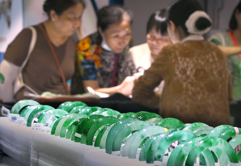 ↑4月16日,观展者在消博会2号馆内的非洲翠展区挑选南非翡翠手镯。王颂 摄