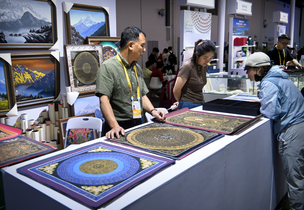 ↑4月16日拍摄的消博会4号馆的尼泊尔展区一角。王颂 摄