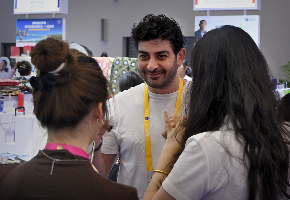 ↑4月16日,在消博会4号馆的叙利亚展区,参展商在与观展者交流。王颂 摄