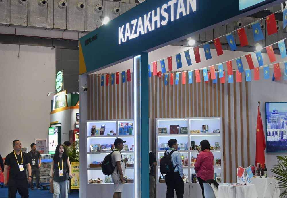 ↑4月16日拍摄的消博会4号馆的哈萨克斯坦展区一角。王颂 摄