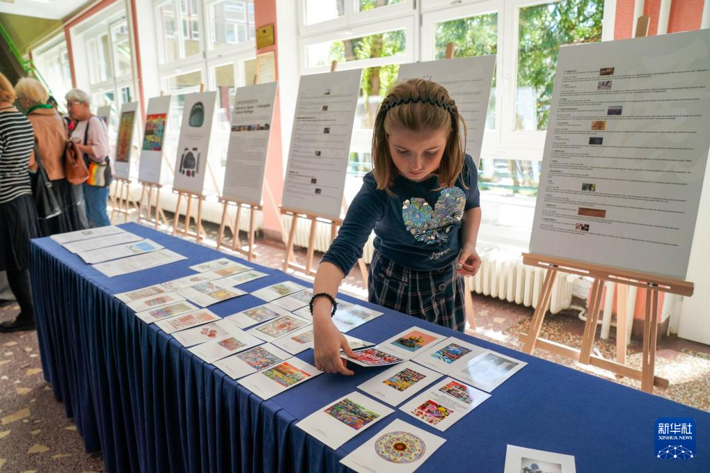 4月19日,一名女孩在波黑萨拉热窝举行的甘肃民间艺术展上挑选明信片。为庆祝“国际中文日”,以“中国非遗 世界共享”为主题的甘肃民间艺术展当天在波黑萨拉热窝大学哲学院开幕。