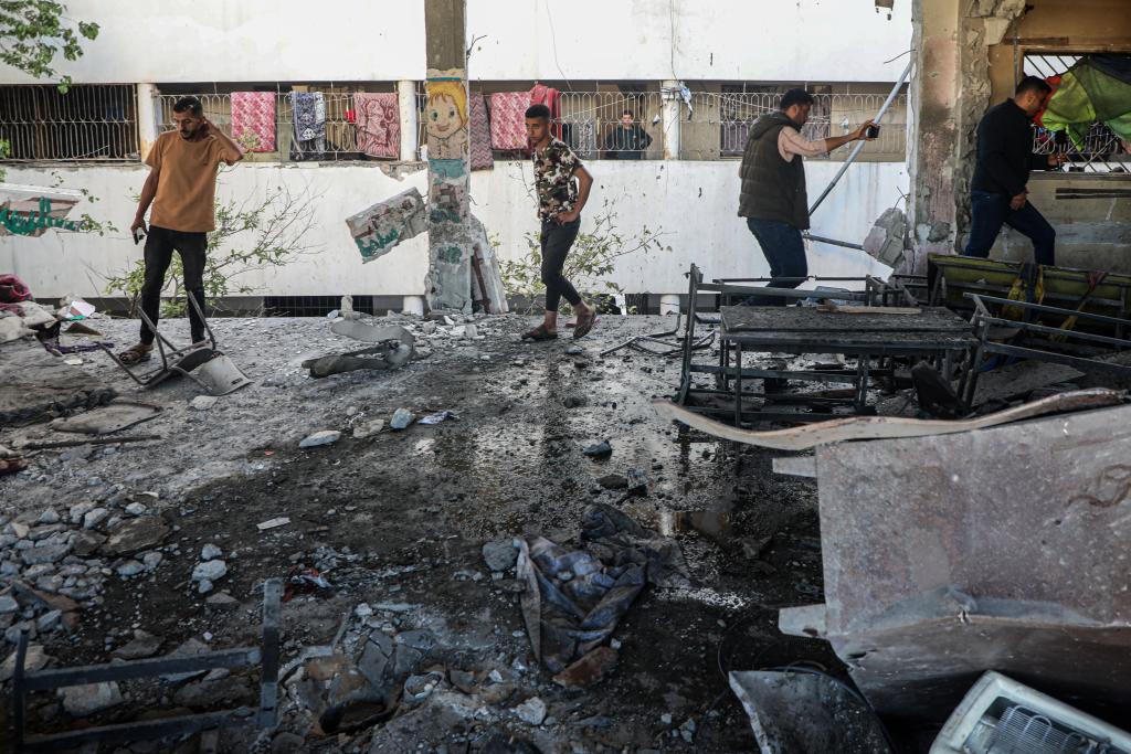 4月25日,在加沙城一所学校,民众查看以军袭击后的废墟。新华社发(里泽克·阿卜杜勒贾瓦德摄)