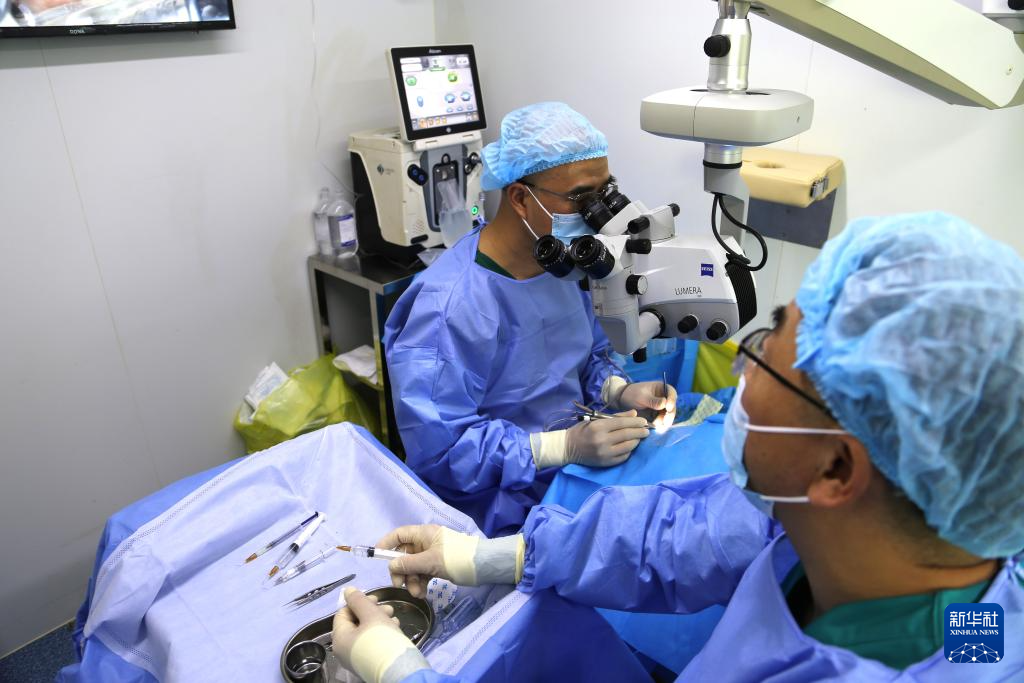 5月2日,在塞内加尔西部法蒂克大区中心医院,来自中国宁德市医院眼科主任医师张招德(左)、宁德市闽东医院眼科副主任医师陈诗源(右)为白内障患者进行复明手术。新华社记者 司源 摄