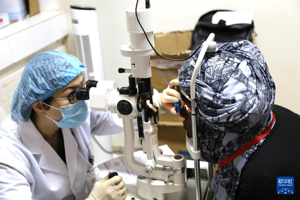 5月2日,在塞内加尔西部法蒂克大区中心医院,来自中国福建省三明市第二医院的眼科主任医师张采华(右)为视障患者进行检查。新华社记者 司源 摄