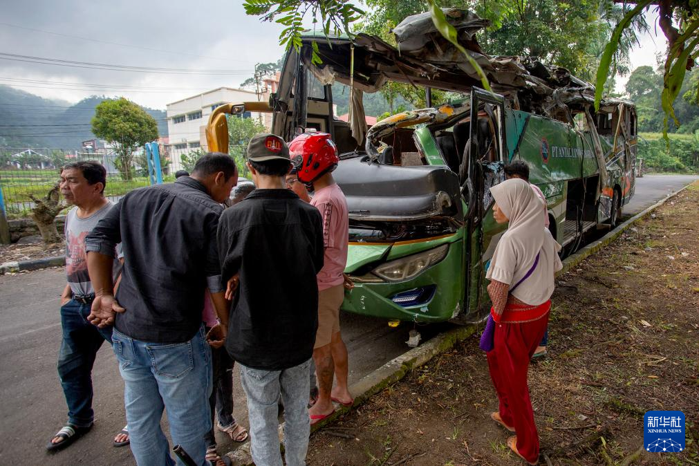 5月6日,在印度尼西亚西苏门答腊省巴东潘姜市,人们聚集在发生事故的长途客车旁。新华社发(安德里·马迪安赛亚摄)