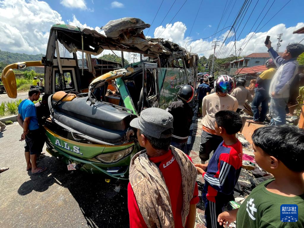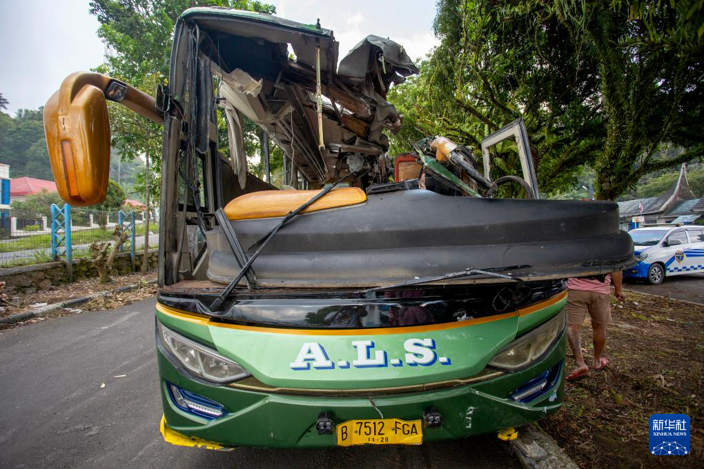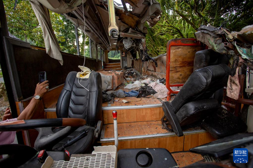 这是5月6日在印度尼西亚西苏门答腊省巴东潘姜市拍摄的发生事故的长途客车。新华社发(安德里·马迪安赛亚摄)